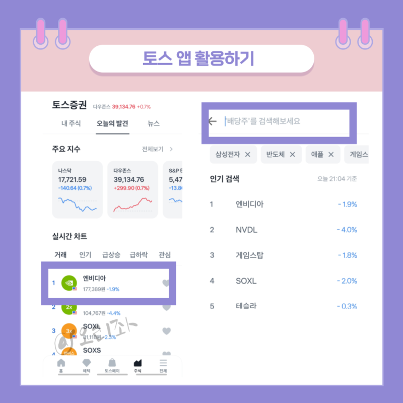 앱 내에서 '주식' 메뉴를 선택한 후, '엔비디아'를 검색하여 해당 주식의 정보를 확인합니다.