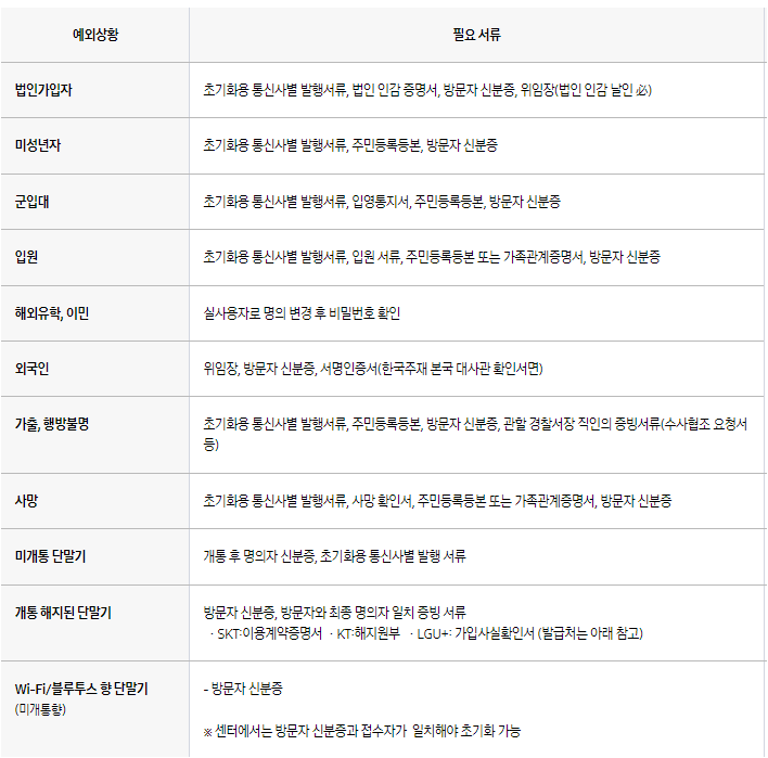 | 필요 서류 | -방문자 신분증 -통신사별 초기화용 서류 |