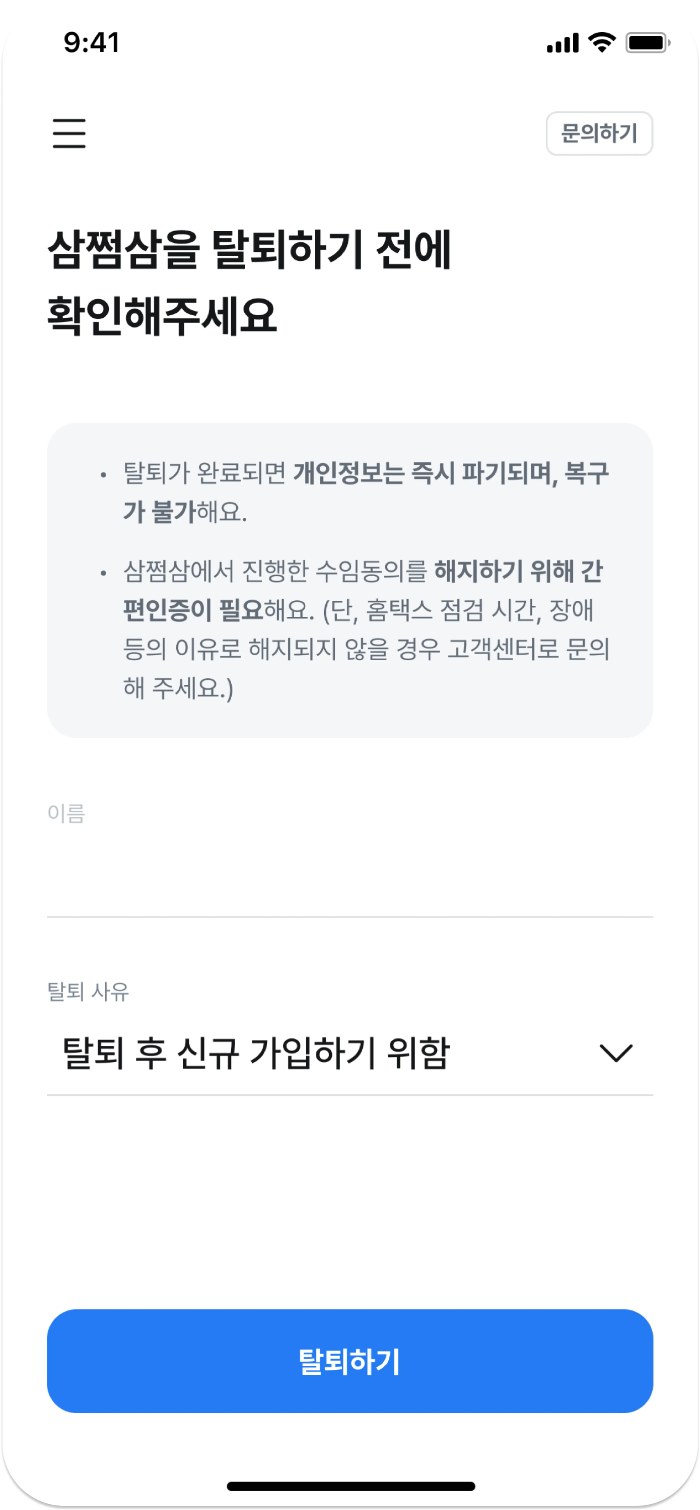 삼쩜삼 회원 탈퇴를 원하시는 경우 홈페이지 내 회원 정보 관리 메뉴에서 탈퇴신청을 할 수 있습니다.