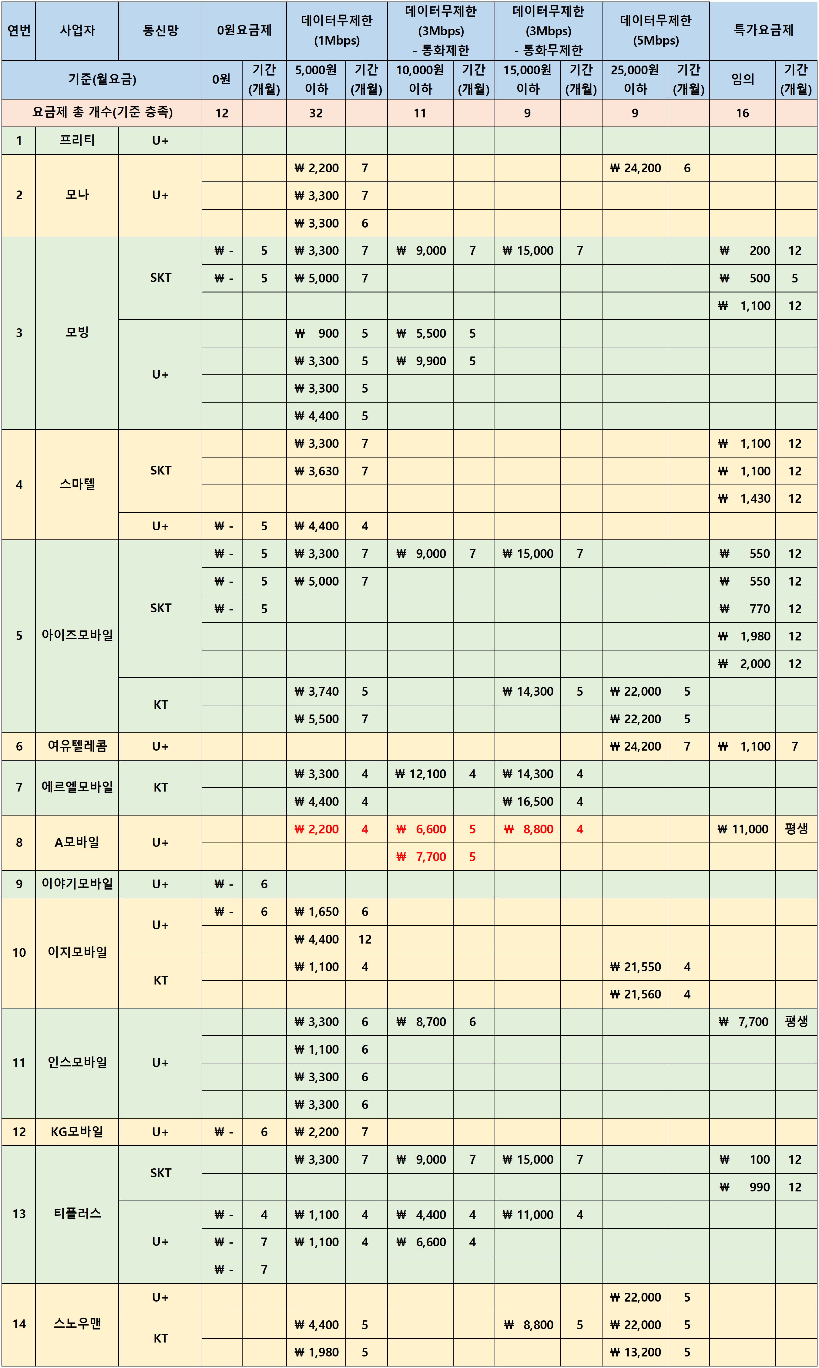 | 9 | 이야기모바일(SKT) | 무료 | 8,800 | 2,750 |