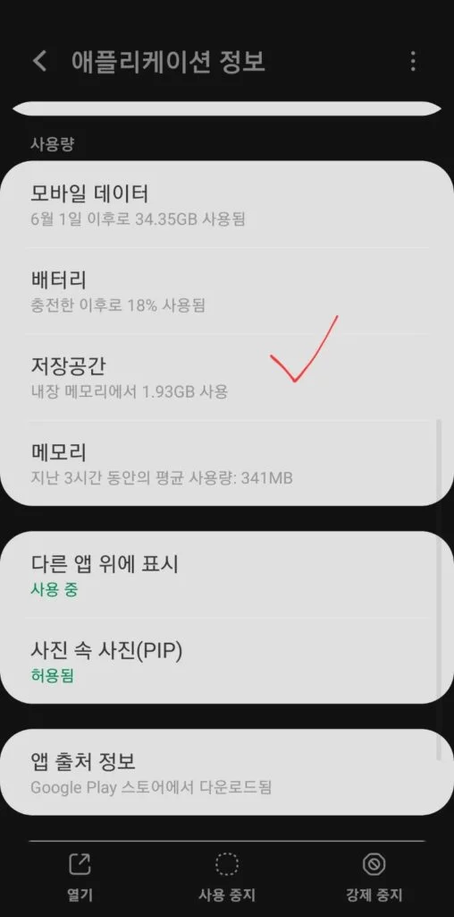 앱의 사용 통계 화면을 통해 데이터 사용량을 확인할 수 있습니다.