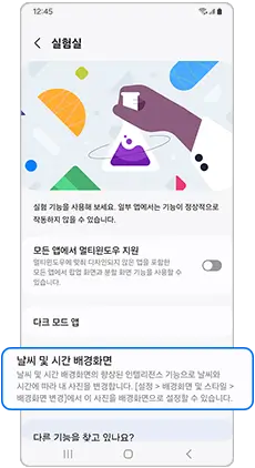 ●설정 > 유용한 기능 > 실험실 > 날씨 및 시간 배경화면 > "날씨 및 시간 배경화면"을 사용중으로 활성화