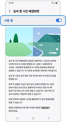 날씨 효과를 잠금 화면의 배경화면에 적용하려면 먼저 날씨 및 시간 배경화면 설정을 켜주세요.