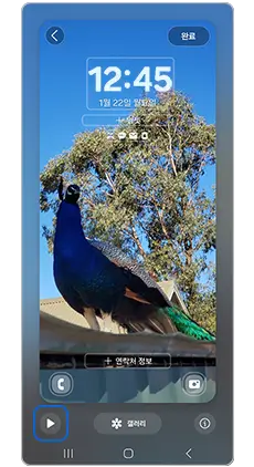 ●홈 화면의 배경을 길게 누름 > 배경화면 및 스타일 > 배경화면 변경 > 크리에이티브 - 날씨 및 시간 > (최초 사용 시) 사용해 보기 > 잠금화면으로 지정할 사진 선택 >. 하단 재생 버튼 > 날씨 애니메이션 예시 화면 > 상단 완료 > 날씨 효과 적용됨
