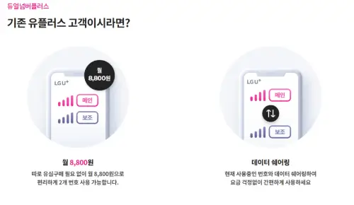 기존의 LG 유플러스 번호가 이미 있으신 분들은 따로 유심을 구매할 필요 없이 월 8,800원으로 서비스를 이용하실 수 있으며 또한 추가 요금 부과 없이 원래 번호의 데이터를 그대로 사용하실 수 있습니다.