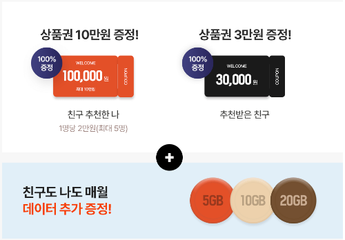 친추만 해도 100% 최대 10만 원 + 데이터 20GB 증정!