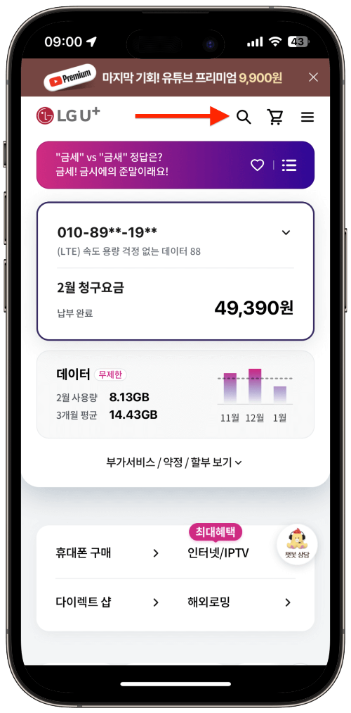 2) LG U+ 앱에 상단에 돋보기 아이콘(검색)을 눌러주세요.