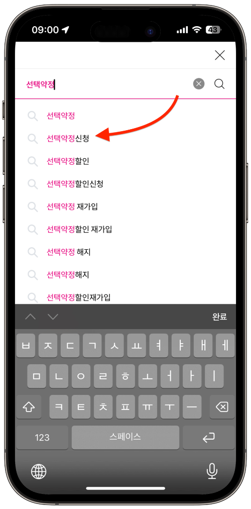 3) 입력창에 '선택약정'이라고 치면 '선택약정신청'이라는 자동완성 문구가 보이실 겁니다.